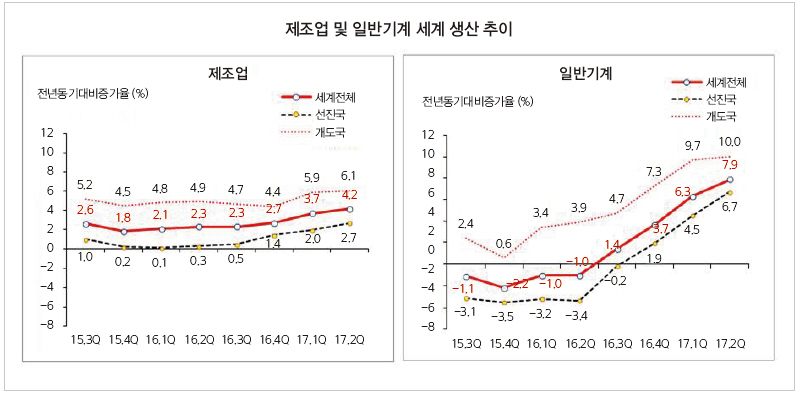 2017년 한해는 저유가에 따른 중동지역 투자 위축에도 불구하고, 중국, 미국 등 주요국의 수요 증가와 베트남 등 신흥국 설비투자 증가 영향으로 수출이 증가하였다. 수출 회복세와 함께 반도체 산업의 호황에 따른 국내 설비투자 증가 영향으로 생산도 동반 상승하였다.