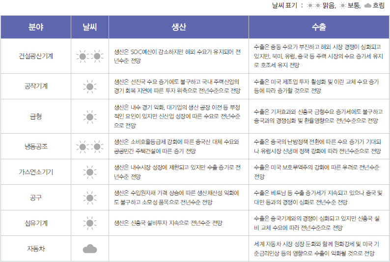 2018년 수출은 품목별로 건설기계, 공작기계는 ‘호전’으로 전망되며 가스연소기기, 냉동공조, 냉동공조, 공구, 금형, 섬유기계는 ‘전년수준’으로 전망되었다. 생산은 냉동공조는 ‘호전’, 건설기계, 공작기계, 금형, 가스연소기기, 공구, 섬유기계 등 대부분의 품목이 ‘전년수준’으로 전망되었다.