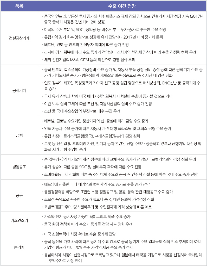 베트남, 인도 등 신흥국의 경우 해당 국가 정부의 설비 및 SOC 투자가 증가하고 있고, 현지 진출 기업의 설비투자가 확대하고 있어 수출은 지속적인 증가를 보일 것으로 예상된다. 수출 증가 예상 품목은 공작기계, 금형, 건설기계 등이다.