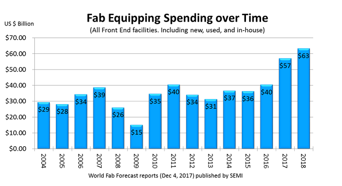 SEMI 세계 팹 전망(World Fab Forecast) 데이터에 따르면 2017년 팹 장비 투자액이 전년 대비 41% 증가한 총 570억 달러이다. 2018년 투자액은 11% 증가한 630억 달러로 예상된다.