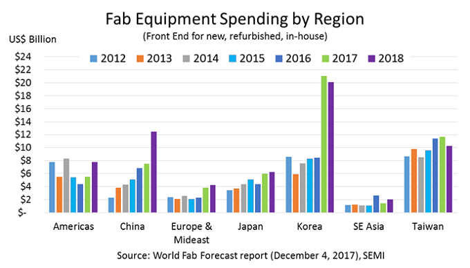 2018년 중국은 2017년에 건설된 팹에 장비를 도입하기 시작할 것으로 예상된다. 예전에는 비(非) 중국계 기업이 중국내 팹 투자의 대부분을 차지하였다. 그러나 사상 처음으로 2018년 중국계 디바이스 제조업체가 비 중국계 업체와 팹 장비에 거의 비슷한 금액을 투자하면서 비등한 수준에 접근할 것이다.