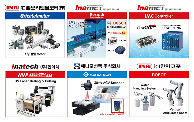 인아그룹은 소형 정밀 모터 전문기업 ‘인아오리엔탈모터㈜’, 자동화 분야 전문 부품 기업 ‘㈜인아코포’, 모션 제어 및 시스템 솔루션 설계·제작 전문기업 ‘애니모션텍㈜’, 디스플레이 및 반도체 장비 제조 전문기업 ‘㈜인아텍’, 모션 컨트롤 전문기업 ‘인아엠씨티㈜’까지 총 5개 계열사로 구성된 스마트 팩토리 솔루션 전문기업이다. 이번 세미콘코리아 2018에는 인아그룹 전 계열사가 총출동한다.
