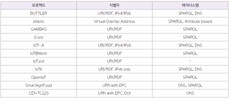 사물인터넷을 위한 식별자 및 해석시스템 관련 프로젝트는 유럽의 IERC(European Research Cluster on the Internet of Things, IoT European Research Cluster)를 중심으로 진행되고 있다. IERC는 여러 개의 Active Chain(AC)로 이루어져 있으며, 그 중에서 AC02 (Active Chain 02)가 표 1과 같이 사물인터넷을 위한 네이밍(Naming), 어드레싱(Addressing), 탐색(Search) 및 발견(Discovery) 주제를 중심으로 11개 프로젝트를 수행하고 있다. 식별자의 경우, Semantic Ontology, W3C SSN Compliant 기반의 RDF(Resource Description Framework) 기반 URI를 사용하거나 기존 RFID에서 사용되던 EPC 기반의 URN를 사용하고 있다.