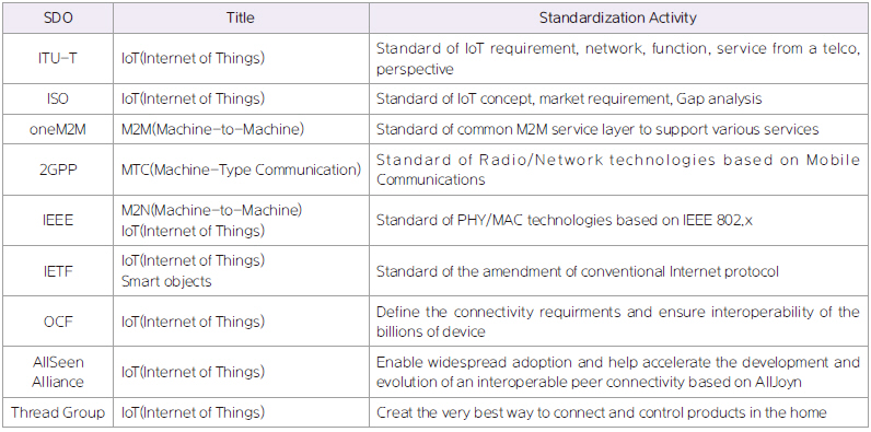 ▲ 표 2. 표준화 기구별 사물인터넷 표준화 주요 활동