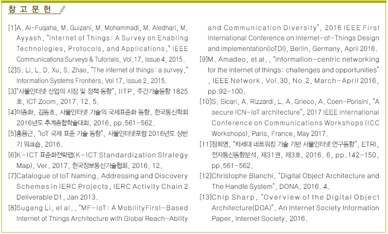 다양한 인터넷 디바이스의 급증으로 인한 데이터 트래픽 폭발은 물론 동일한 콘텐츠의 중복 전송 이슈 등과 같은 비효율적인 현재 인터넷(Legacy Internet) 문제점을 해결하기 위해 처음부터 인터넷 구조(Architecture)을 새롭게 설계하고자 미래인터넷(Future Internet)의 대표적인 아키텍처로 정보 중심의 네트워킹(Information-Centric Networking: ICN)이 부각되었으며 현재 전 세계적으로 관련 연구가 진행되고 있다. 최근 인터넷관련 국제표준화 기구인 IETF(Internet Engineer Task Force)의 사전연구기관인 IRTF (Internet Research Task Force) 내 ICNRG(Information Centric Networking Research Group)에서는 사물인터넷에 ICN 개념을 적용하는 경우에 대한 요구사항은 물론 다양한 기술적 이슈를 분석하는 문서와 효율적인 사물인터넷을 위해 ICN을 사용하는 경우의 응용 및 Tradeoff 등을 포함하는 문서 등 관련 연구 작업이 진행 중이다.