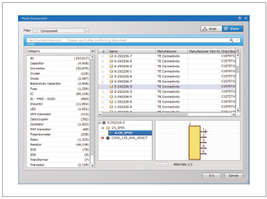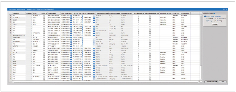 회로도 작성이 끝나고 Component Attribute 기능을 실행하면 회로도에 사용된 부품의 용량 값이나, 관리 품번과 같은 속성 값을 한번에 관리/검토할 수 있다. 디지키(Digi-key)나 로옴(ROHM)의 Part Number를 속성 값으로 가지고 있는 부품은 i모양 아이콘을 통해 이 화면 안에서 해당 회사의 서버로 바로 접속이 가능하다. 서버에 접속해 부품의 최소 구매 수량(MOQ)이나 Datasheet 정보, 단가 등을 실시간으로 확인할 수 있고 이 값들을 다시 내 Local 화면으로 가지고 들어올 수 있다. 또 Component Attribute 화면상에서 부품의 용량 값이나 높이 정보와 같은 속성 값을 변경하면 이 내용이 다시 회로도에 반영되는 Back Annotation 기능이 구현되어 있다.