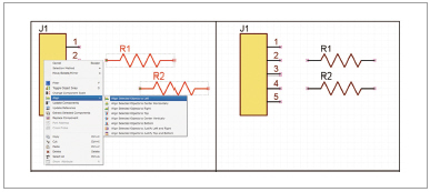 부품 배치를 돕는 편리한 기능 몇 가지를 소개하고자 한다. 먼저 Symbol의 배치 상태를 정렬할 수 있는 Align 기능(Symbol 정렬 기능 이미지 참조)이 있다. 정렬하고자 하는 Symbol을 다중 선택 후, 마우스 오른쪽 버튼을 누르면 부품을 원하는 방향대로 손쉽게 정렬할 수 있다.