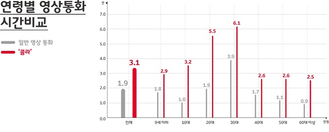 55세 이상 어르신의 경우 콜라를 주로 자녀·손주와의 소통에 활용하고 있었다. 그중에 전체 통화 중 65%가 자녀·손주와의 통화인 것으로 나타났다. 특히 이들의 콜라 이용 시간은 일반 영상통화 사용 시보다 2배 이상 긴 것으로 집계됐다. ‘콜라’의 간편한 인터페이스와 다양한 AR 꾸밈 효과 덕분에 자녀·손주와 평소보다 더 오래 통화를 즐기고 있다는 분석이 나온다.