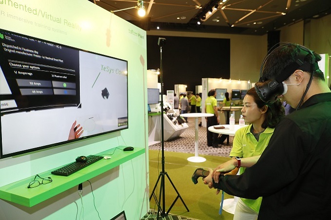 슈나이더 일렉트릭이 ‘이노베이션 서밋 서울 2018’ 에서 산업용 소프트웨어, 몰입형 교육용 트레이닝 시스템인 AR/VR Immersive Training System을 선보이고 있다.