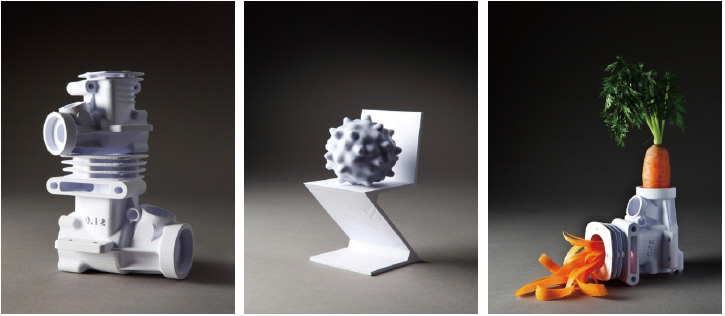 2D 인쇄에 사용되던 CMYK 컬러 잉크를 그대로 사용하여 조형하고자 하는 컬러를 거의 그대로 출력할 수 있기 때문에 최상의 디테일을 얻을 수 있다는 장점이 있습니다. 다만, 조형 과정이 완료된 후 분말을 제거하고 표면 처리를 해야 하는 번거로움이 있습니다.