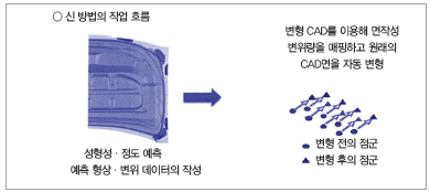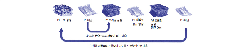 또한 종래에는 최종 공정 패널이 도면 형상이 되도록 드로 공정에 예측을 해 왔다. 그러나 드로 패널의 형상과 트리밍형의 형상이 다르기 때문에 구멍이나 제품 끝단 위치의 어긋남에 의해 버가 발생, 트리밍 금형의 형상맞춤이 필요해지고 있었다. 그래서 드로형에는 종래 대로 도면 형상이 되도록 예측을 하는데, 트리밍형에도 드로로 스프링백한 결과의 형상이 되도록 예측함으로써 패널의 맞춤 공수 저감을 목표로 했다(그림 2).