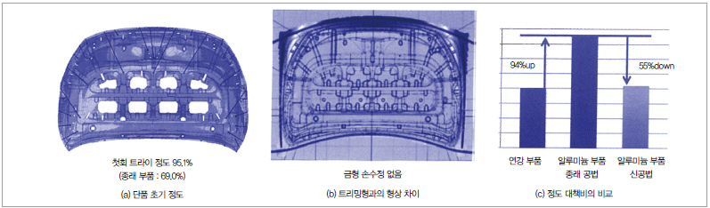 이들 예측 방법을 우선 내판 부품에 적용해, 효과를 확인했다. 확인한 부품은 후드이너, 재질 : 6,000계 알루미늄이다. 결과 단품 초기 정도는 95.1%(종래 부품 69%)로, 연강 동등의 공구까지 저감할 수 있었다(그림 3).