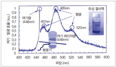 실제 가공에 이용되고 있는 절삭액 MP15[Daphne Magplus MP15; 出光興産(주), 굴절률 1.4588]은 파장 440nm 근방의 여기광에 의해 파장 457~520nm의 형광을 발하는 특성을 가지고 있다. 그래서 파장 448nm의 반도체 레이저(iBeam smart; TOPTICA사)를 여기 광원으로서 이용한 경우의 형광 분광특성을 측정했다. 분광기(Osean Optics; USB 4000)를 이용한 측정 결과를 그림 1에 나타냈다. 여기광 파장과는 별도로 457nm, 485nm, 520nm으로 형광 스펙트럼의 피크를 볼 수 있다.