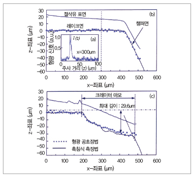절삭액 MP15를 도포한 광택면을 갖는 가공 전의 공구 날끝에서는 그림 5 (a)의 형광 신호를 얻을 수 있고, 그림 5 (b)에 나타낸 프로파일은 촉침식 표면조도계와 양호하게 일치하고 있다. 한편, 그림 5 (c)는 비교적 얕은 마모(최대 깊이 : 29.6μm)를 갖는 거친면의 측정 결과이다. 절삭액 막의 영향을 받지 않고 마모를 포함하는 날끝 형상의 특징을 파악하고 있으며, 이 방법은 수 μm~수십 μm에 미치는 절삭액 막의 영향을 받지 않고 공구 날끝 미세 형상을 고정도로 측정 가능하다는 것을 나타냈다.