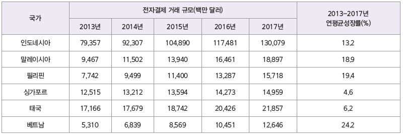 2017년 아세안 소비자의 전자결제 거래 규모는 2142억 달러로 2013년부터 연평균 13%씩 빠르게 성장 중이다. 아세안 중산층 인구 증가와 도시화 가속화에 따라 2020년까지 전자결제 시장 규모는 연평균 8%씩 성장해 2667억 달러에 이를 것으로 전망된다.