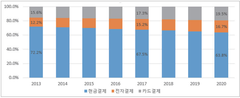 2017년 기준, 아세안 현금 결제 거래 규모는 전체 소비자 결제의 67.5%를 차지했다. 그럼에도 불구하고 최근 아세안 국가들의 인터넷·모바일 보급률이 높아지고 국가별 정부 주도의 무현금사회 추진 정책으로 인해 현금결제의 비중이 줄어들고 있는 추세다.
