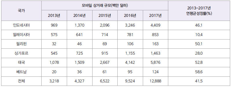 또한 아세안 중산층 인구가 증가하면서 스마트폰, 태블릿 등 모바일 장비의 사용이 늘어나고 있다. 2018년 1월 기준 아세안의 모바일 보급률은 68%로 세계 평균 수준과 동일하다. 이와 함께 아세안 모바일상거래 시장은 2013년부터 연평균 41.5%의 놀라운 속도로 성장해 왔다. 2017년 아세안 모바일상거래 시장 규모는 129억 달러로 2013년 대비 4배가 성장한 것이다.