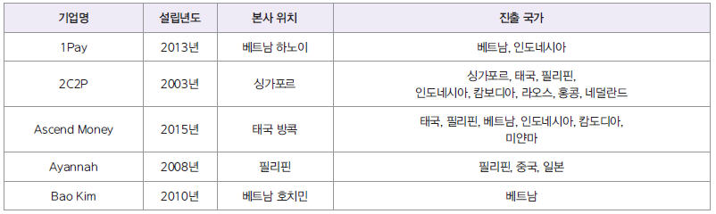 ▲ 표 3. 아세안 탑 전자결제 핀테크 스타트업(2017년 기준)