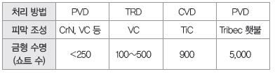 냉간 프레스 성형 금형에서는 단수명의 원인이 되는 마모나 스커핑 등을 억제하는 것을 목적으로, TRD법이나 CVD법이 적용되어 왔다. 처리는 어느 것이나 고온의 용융염으로 이루어지며, 처리 시간이 빠르고 피막밀착성이 양호하고 반복 처리가 가능하다는 것 등이 현재도 널리 채용되고 있는 이유일 것이다. 그러나 처리 온도가 1,000℃ 이상으로, 금형 강재의 변태점 이상의 고온 처리가 되기 때문에 금형의 치수 변화가 생길 가능성이 높다. 시장에서는 금형의 고정도 요구가 많아지고 있으며, 금형의 변형 및 치수 변화가 문제가 되는 케이스가 곳곳에 보인다.