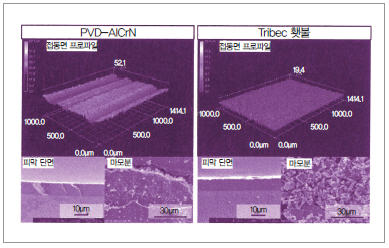 AlCrN에는 많은 스크래치 흔적과 피막 표면에서 발생한 크랙이 존재, 약 100μm의 마모분이 확인된다. 한편 Tribec 횃불의 접동 후 표면은 평활하며, 피막 바로 위에는 균등하게 형성된 Fe 산화물이 존재하고 마모분도 AlCrN의 것보다 미세하다는 것이 확인됐다.