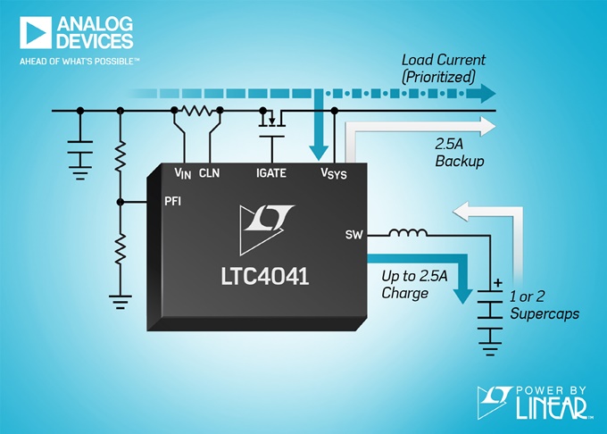 아나로그디바이스(ADI)는 주전원에 오류가 발생했을 때 반드시 활성상태를 유지해야 하는 2.9V ~ 5.5V 전원 레일을 위한 수퍼커패시터 백업 전력관리 시스템인 파워바이리니어(Power by Linear) LTC4041을 출시한다고 밝혔다. 수퍼커패시터는 배터리보다 높은 전력 밀도를 갖고 있기 때문에 짧은 기간 동안 높은 피크 전력 백업을 요구하는 시스템에 이상적이다.