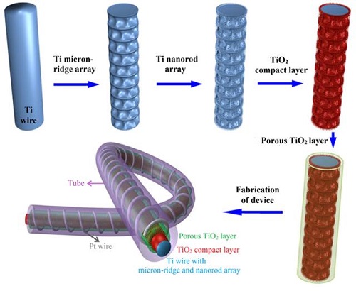 한국과학기술연구원(이하 KIST) 에너지저장연구단 이중기, 리우구쳉 박사 연구팀은 티타늄와이어의 양극산화 및 표면개질을 이용해 줄 모양의 태양전지 기술을 개발하였다. 이번 태양전지 기술은 기존 태양전지와 차별되는 용량, 수명, 전극형상을 지니고 디바이스 공간 설계의 한계를 극복할 수 있다는 것이 특징이다.