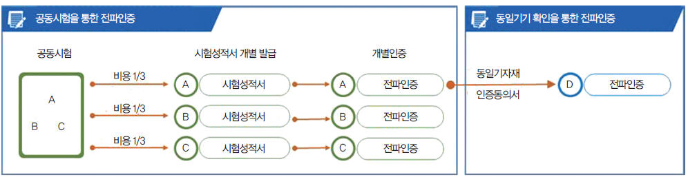국립전파연구원은 산업용 무선기기에 대한 전파인증 규제 완화와 함께 영세한 병행수입업체 등의 부담 완화를 위해 ‘공동 적합성평가 시험 신청제도‘를 신설하고, ‘동일기자재 인증 동의서‘를 획득하면 시험절차를 생략하는 등 시험·인증 절차를 개선하였다.