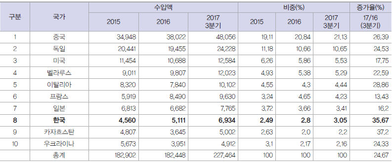 ▲ 러시아의 주요 수입국 및 수입액 (단위: 백만 달러, %)