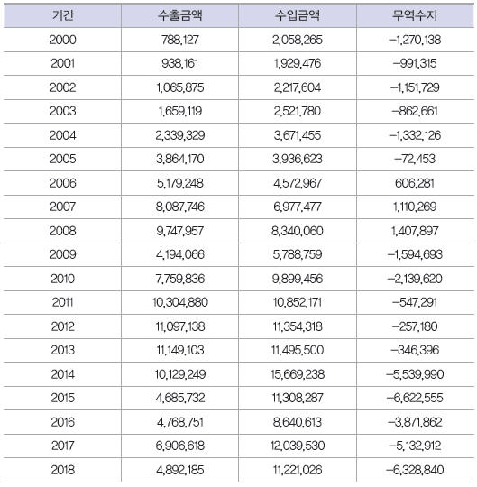 ▲ 한국의 러시아 수출입 실적(2000 ~ 2018년 8월) (단위 : 천 달러(USD 1,000))