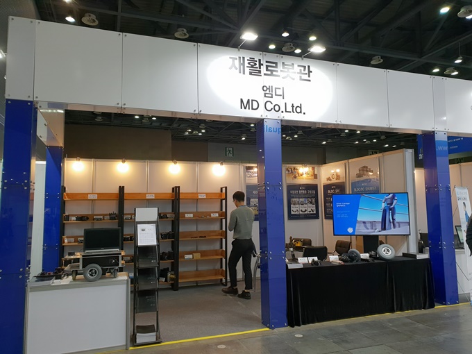 엠디가 10월 10일부터 13일까지 킨텍스에서 개최하는 ‘2018 로보월드’에 참가해 이동형 보행재활로봇을 주력을 선보였다.