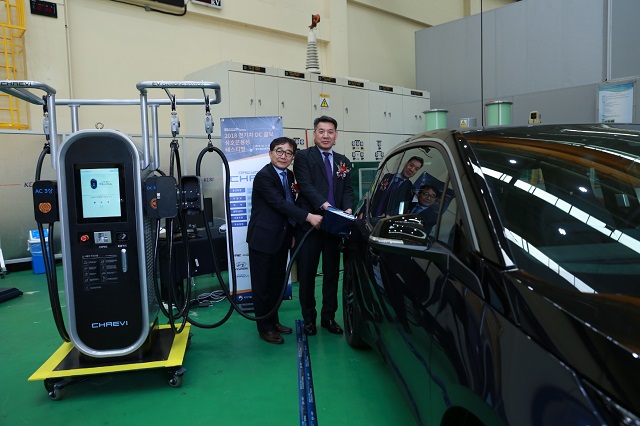 ▲ 한국스마트그리드협회 정찬기 부회장(왼쪽)과 한국전기연구원 김맹현 시험부원장(오른쪽)이 '전기차 DC 콤보 상호운용성 테스티벌' 시험장에서 포즈를 취하고 있다. <사진 : 한국전기연구원 제공>
