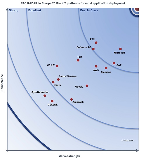 PAC는 이번 리포트를 위해 120개의 플랫폼을 조사하고, 이 중 43개를 7가지 항목에 대해 평가했으며, PTC는 특히 애플리케이션의 빠른 적용, 인더스트리얼 디바이스 역량에서 최고점을 기록했다.