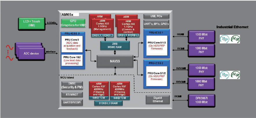 AM6x 프로세서는 PRU-ICSS 서브시스템의 3개의 인스턴스를 포함한다. 하나는 ADC 인터페이스에 쓰이며, 2개 PRU-ICSS 서브시스템을 HSR/PRP 프로세싱을 위해 남겨뒀다. 각각의 PRU-ICSS는 2개의 이더넷 포트를 지원하므로 총 4개의 이더넷 포트를 지원한다.