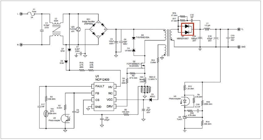 ▲ 그림 3. 1 차측 및 2 차측 트랜지스터를 보여주는 스위치 모드 전원 공급 장치의 예
