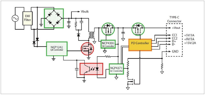최신 고전력 밀도 USB-PD 어댑터는 낮은 온-저항(On-resistance) 모스펫(MOSFET)을 대신 사용해 다이오드와 관련된 손실을 방지한다[그림 2].