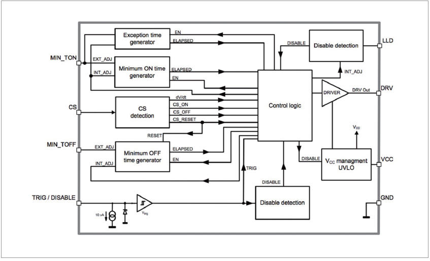 내부적으로 이 디바이스는 PCB 레이아웃과 다른 기생 소자로 인한 링잉을 방지하기 위해 최소 온/오프 시간 블랭킹(Blanking) 기간[그림 4]을 설정하기 위한 블록을 포함하고 있어 앞서 설명한 대로 뜻하지 않은 바디 다이오드 전도를 초래할 수 있다. 두 가지 모두 외부 저항을 사용해 타이밍 매개변수를 조정할 수 있어 필요한 전력 출력과 선택한 전력 부품에 맞게 설계를 최적화할 수 있다. LLD(Light Load Detection) 블록은 출력 부하가 감소할 때 전원이 스킵 모드에서 작용하며 스위칭 펄스의 주파수 감소를 감지하며, 동기식 정류 컨트롤러를 Disable mode로 전환시킨다. 이 컨트롤러는 USB-PD 전원 어댑터가 CoC Tier 2 요구사항을 준수할 수 있도록 매우 낮은 전류(대게 37uA)를 소비한다.