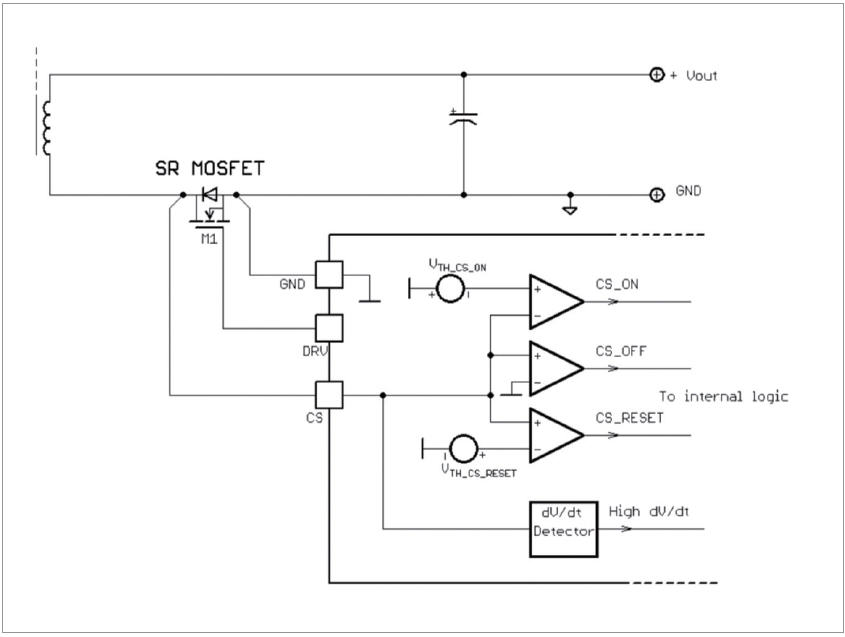 [그림 5]는 직접 감지 기능을 제어하는 내부 회로를 보여준다. 동기식 정류 MOSFET M1은 스위치의 드레인 단자에 연결된 CS핀의 전압이 VTH_CS_ON 임계치보다 낮아지면 켜진다. 그 후 CS핀 전압이 VTH-CS_OFF(Typically 0.5 mV)보다 높아지면 MOSFET은 바로 꺼진다. NCP4306은 다이렉트 센싱 블록 내 dV/dt 슬로프 디텍터가 있어 유휴 상태에서 공진 파형과 실제 주 스위치의 턴온 저항을 구별한다. 이는 다양한 출력 전압과 부하 프로파일을 갖는 USB-PD 설계에 특히 중요하며, 필요할 때마다 컨트롤러가 MOSFET을 활성화시킨다.