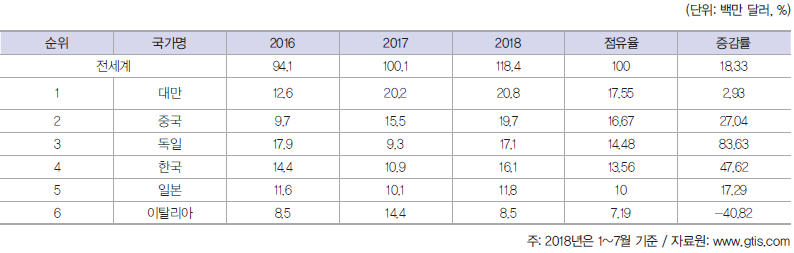 주요 수출국은 아시아 및 유럽 국가들로 대만, 중국, 독일, 한국, 일본, 이탈리아 순이다. 해마다 국가 순위가 조금씩 변동되지만 상위 순위 국가들의 경우 대부분 순위가 고정돼 있다.