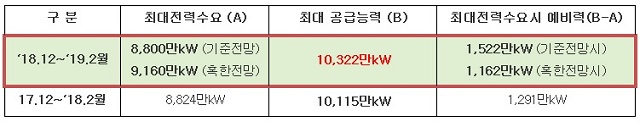정부는 전력 공급능력을 1억 322만kW를 확보하여, 예상치 못한 한파가 발생에도 예비력은 1,100만kW 이상 유지될 것으로 전망했다.