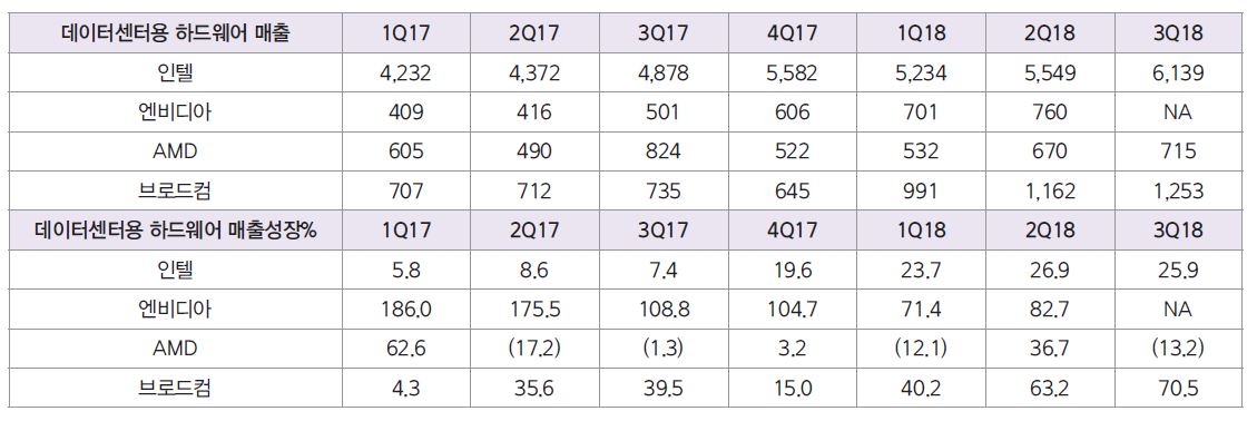 실제로 데이터센터 시장에서 인텔의 매출 성장은 2017년 3분기까지만 해도 한 자릿수 였지만, 2017년 4분기부터 두 자릿수로 껑충 뛰어서 올해 매분기 마다 성장률이 상승했다. 데이터센터용 반도체 매출 2위인 브로드컴 또한 2018년 실적 호조를 보였다. 올해 2분기부터 매출이 처음으로 10억 달러를 넘어서 11억6200만 달러를 기록했고, 3분기에는 12억5300만 달러로 상승했다.
