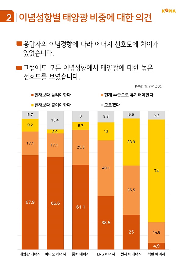 이번 조사 결과에 따르면, 태양광 에너지의 경우 진보 80.2%, 중도 65.7%, 보수 54.6% 등 모든 이념 계층에서 선호도가 높은 것으로 조사됐다. 하지만 원전은 이와 반대되는 결과를 보였다. 원자력에 찬성하는 진보 성향의 비중은 14.9%에 그쳤고, 보수 성향 역시 40.8%에 밑도는 결과를 기록했다.