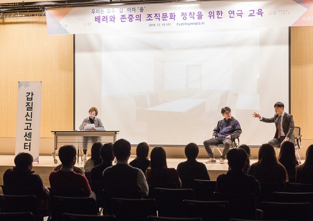 이번 연극교육은 설명 위주의 주입식 교육에서 벗어나 실제 일어날 수 있는 갑질 상황을 연극으로 꾸며 직원들의 이해를 돕는 동시에 갑질 근절에 대한 관심을 높이고자 마련됐다.