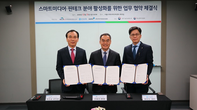 한국방송통신전파진흥원(원장 서석진, 이하 KCA), 우리은행(행장 손태승), 스마트미디어산업진흥협회(회장 박대수, 이하 SMPA)은 지난 21일, 서울 상암동에 위치한 서울스마트미디어센터에서 스마트미디어․핀테크 분야 활성화를 위한 3자간 업무협약을 체결했다.