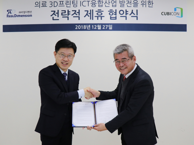 지난 12월 27일, 정형/재활 의료분야 3D 프린팅 맞춤형 보조기 제작 전용 CAD 솔루션 개발 기업 (주)리얼디멘션과 국내 3D 프린터 대표 기업 (주)큐비콘이 의료 분야 3D 프린팅 ICT 융합 사업 활성화를 위한 전략적 업무 협약을 체결했다고 밝혔다.