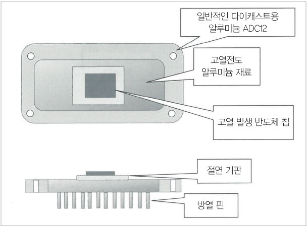 표에 일반적으로 이용되는 알루미늄 다이캐스트 재료의 물성을 나타냈다. 개발의 방향으로서 반도체 칩 바로 아래의 부분은 고열전도 알루미늄으로 하고 열전도율을 높여 장착 등이 필요한 주변의 부분은 어느 정도 강도를 확보할 수 있어 실적이 있는 ADC12를 사용하는 것을 결정했다(그림 2). 또한 이 글에서 고열전도율 알루미늄은 순알루미늄에 매우 근사한 알루미늄 재료이다.