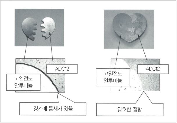 따라서 ADC12를 먼저, 순알루미늄에 가까운 고열전도 알루미늄을 나중에 사출함으로써 먼저 사출한 ADC12의 표층을 재용융시킬 수 있다. 그림 6의 오른쪽 측에 양호하게 결합된 상태를 확인할 수 있다.