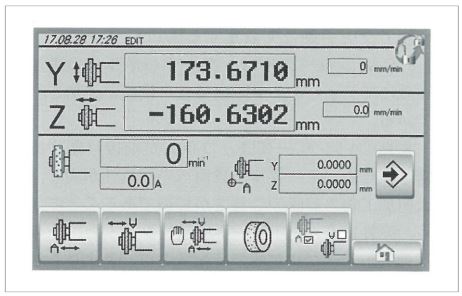 조작반(그림 3)에는 화면 터치가 쉬운 10인치 대형 컬러 화면을 채용. 조작 키․설정 키 등을 가능한 한 크게 표시시킴으로써 오조작을 방지하는 동시에 사용성을 추구했다(그림 4). 또한 터치패널 채용에 의해 물리적인 스위치 수가 적어진 것에 더해, 이 기계용으로서 새롭게 개발된 소프트웨어 탑재에 의해 연삭 조건의 보다 정량적인 설정과 일괄 관리가 가능해졌다.
