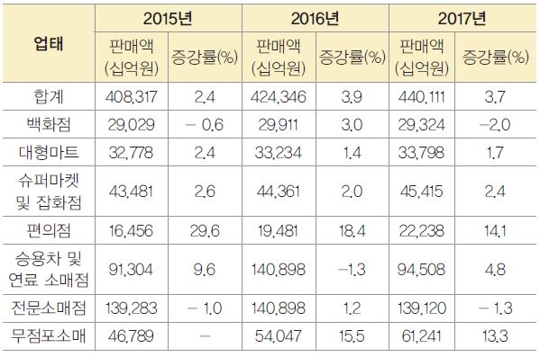 통계집에 따르면, 2017년 무점포 판매액은 전년 대비 13.3% 증가한 61조 2,000억원을 기록했다. 인터넷·홈쇼핑·방문 및 배달 소매를 합친 무점포 판매액은 2015년 46조 7,000억원, 2016년 54조원 등 매년 10%대의 증가율을 거듭하며 60조원 시대에 들어섰다.