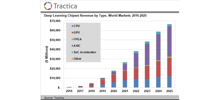 AI 가속 프로세서는 다양한 학습과 자연어 처리, 추론에 이르는 다양한 작업 및 분야에 적용될 것으로 보인다. 특히 딥러닝 분야는 많은 접점을 가지고 있다. 시장조사기업 Tractica는 딥러닝 칩셋 시장이 ’17년 16억 달러에서 ’25년이면 6백63억 달러로 증가할 것이라는 보고서를 내놓았다.