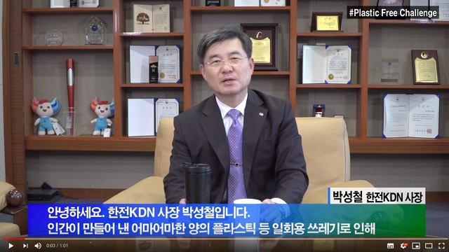▲ 한전KDN 박성철 사장이 '플라스틱 프리 챌린지'에 동참했다. <사진 : 유튜브 캡처>